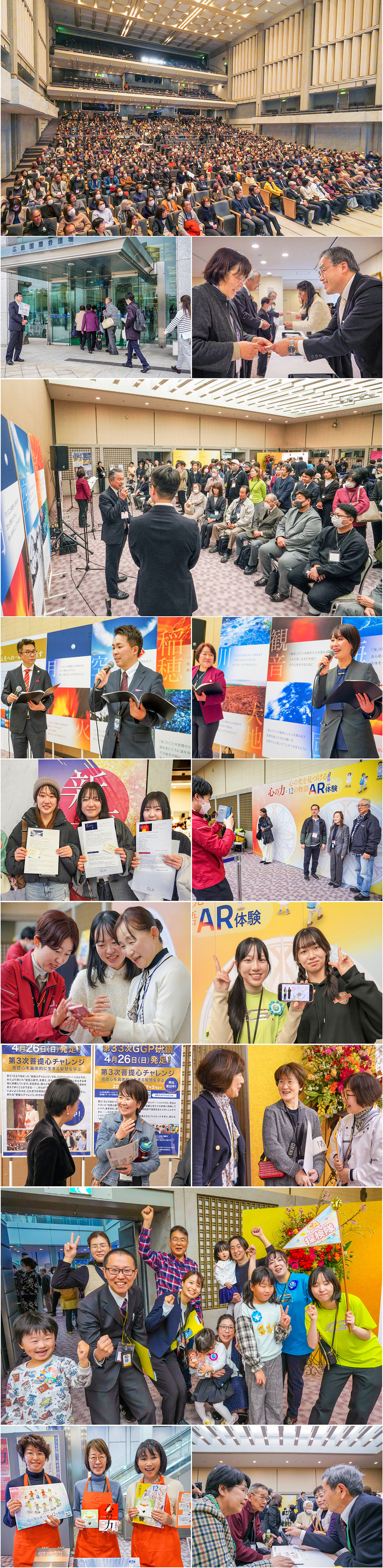 この日の広島は、春が訪れたかのような暖かさで、会場となった広島国際会議場フェニックスホールには、約1500名の参加者が参加されました。ロビーでは、自らの心のタイプと傾向がわかる「自己診断コーナー」、GLAの紹介コーナー、『心の力』『心の光を見つける12の物語』のAR体験コーナーのほか、この日、参加者にお渡しする「神理カード」に記された「菩提心」(本当の自らを求め、他を愛し、世界の調和に貢献する心)を生きた方々によるプレゼンテーションなどが展開され、開始前から多くの方々であふれていました。