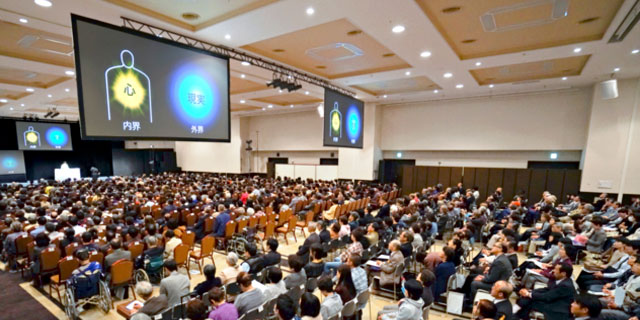秋のさわやかな晴天に恵まれ、会場には2000名を超す方々が詰めかけました。ロビーには、青年塾、専門分野など、高橋先生が提唱する「魂の学」をわかりやすく紹介する様々なコーナーが設置され、立錐の余地もないほどの賑わいです。