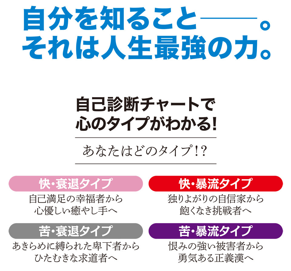 先生は、そこから「暗示の帽子」を脱いで、本当の自分を知ることへと読者を誘われます。「最初の自分」(偽我)→「次の自分」(善我)→「最終形の自分」(真我)という道ゆきの中で、人間には4つの心のタイプがあることを示し、「自己診断チャート」で1人ひとりが自らのタイプを知り、その弱点(闇)を超えて、素晴らしい可能性(光)を引き出すことへと導いてゆかれるのです。まさに自分を知ることは人生最強の力――。